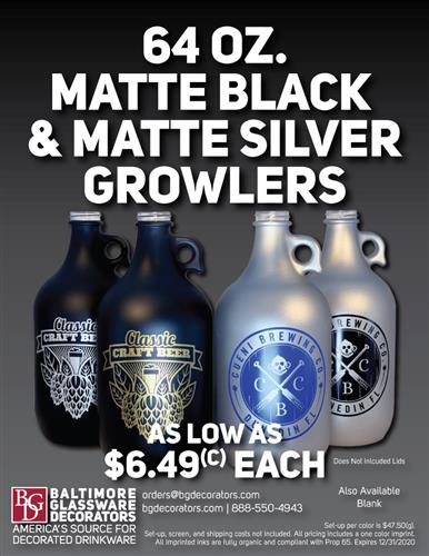 New 64 oz. Matte Black and Matte Silver Growlers from Baltimore Glassware Decorators